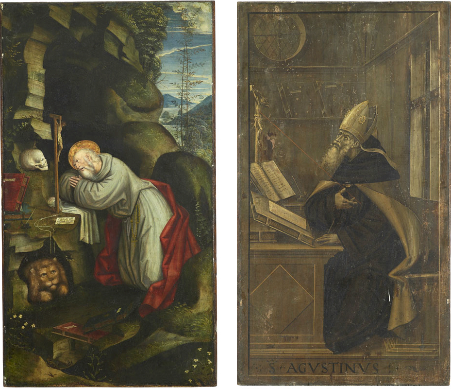 «L’arte piemontese offre l’esempio di ante con il retro dipinto come qui, in grisaglia, come i pannelli di Defendente Ferrari nella chiesa di San Giovanni d’Avigliana (Luigi Mallé, 1971, fig. 129-133). Ma non si sa come fossero disposti questi pannelli. Erano allo stesso livello? È lecito dubitarne; da un lato, la prospettiva di “Sant’Agostino che insegna agli eremiti” è più prominente di quella di “San Girolamo in preghiera”. Inoltre, i caratteri delle iscrizioni differiscono nelle due grisaglie.»