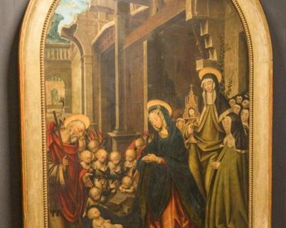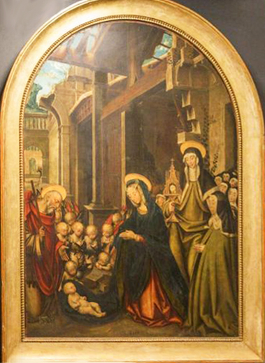 L’altra tavola, conservata nella sala del capitolo attigua alla sacrestia, raffigura una Adorazione del Bambino con Santa Chiara e clarisse; proviene dall’ex convento di Santa Chiara ad Ivrea, soppresso nel 1802.