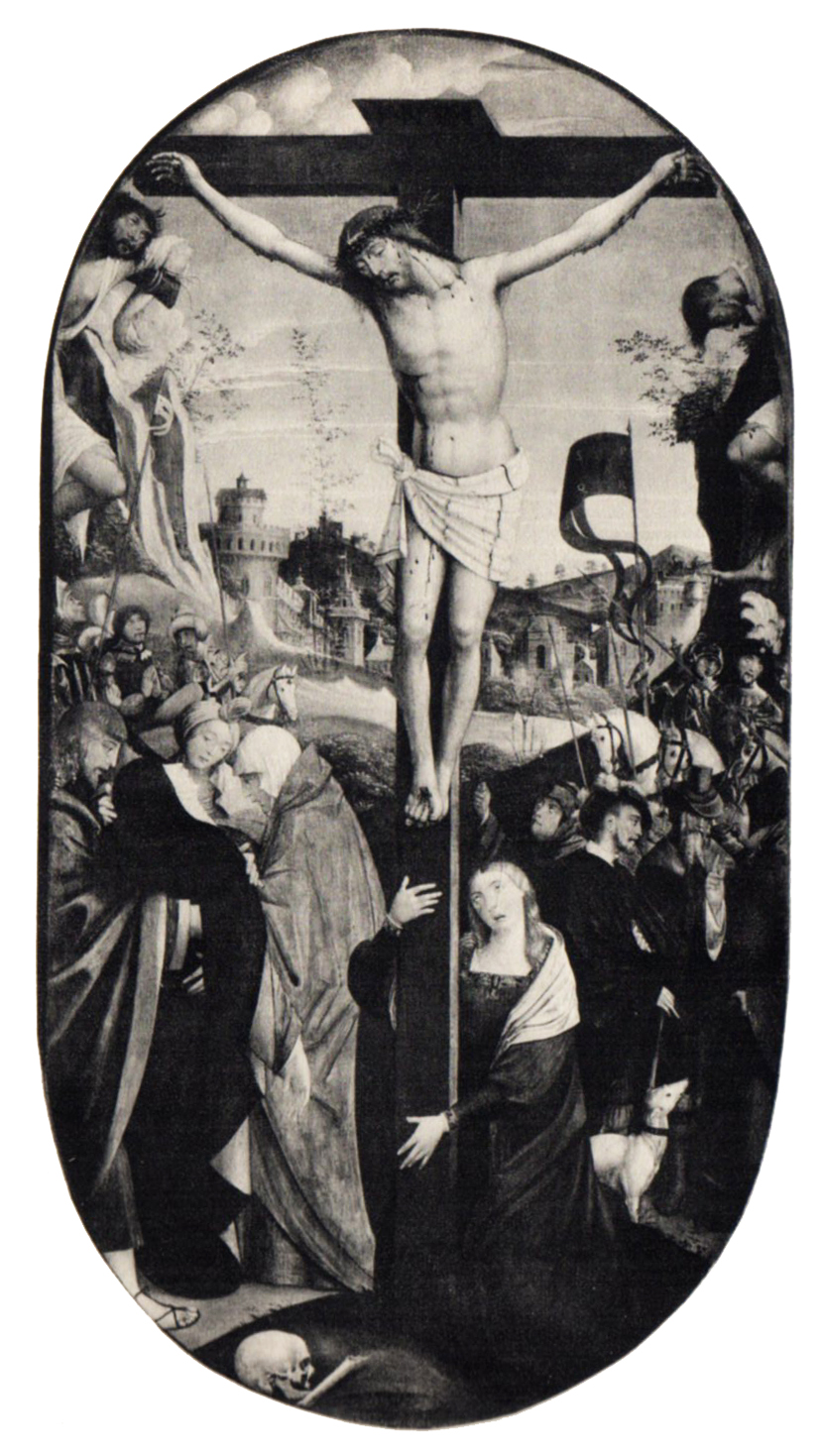 Lo stesso tema iconografico della Crocifissione affollata su un’ampia apertura di paesaggio, realizzata nel 1518-1523, su una piccola tavola (51 x 77 cm) e conservata a Torino nel Museo Civico d’Arte Antica/Palazzo Madama, vedi scheda vedi scheda fu ripetuto da Defendente in grandi dimensioni su questa tavola.