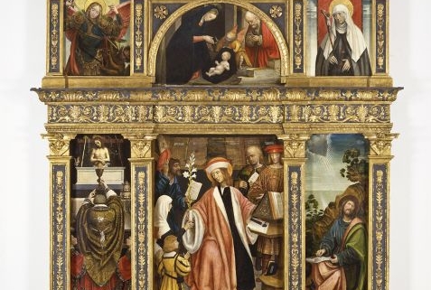 Il polittico con Sant’Ivo che raccoglie le suppliche dei poveri, tra la Messa di san Gregorio e san Giovanni evangelista a Patmos.