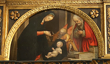 L’Adorazione al centro del registro superiore, tra i santi Michele e Caterina, è invece stilisticamente e iconograficamente vicina a quella della tavoletta, sempre di Defendente, conservata al Museo Borgogna di Vercelli (1520 circa), vedi scheda.