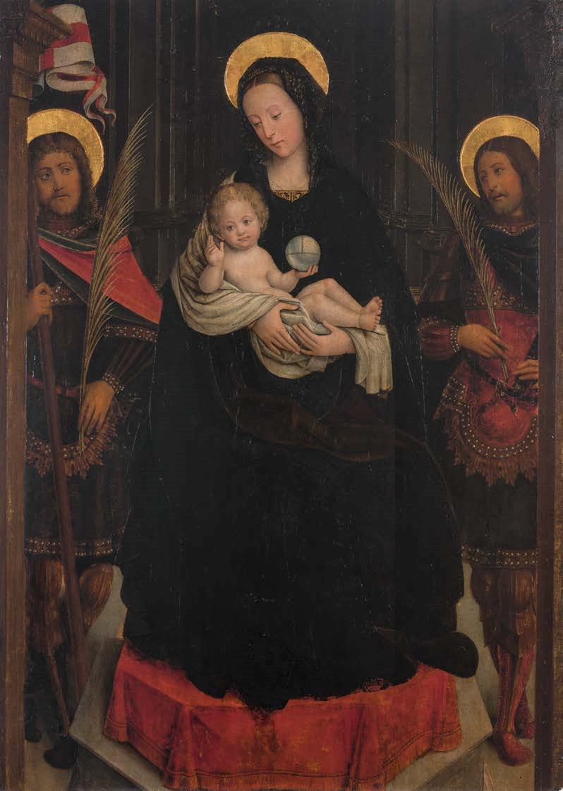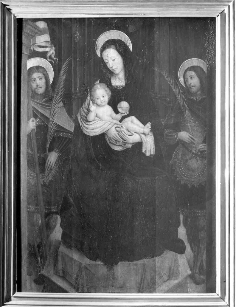 Affiancano la Madonna due Santi martiri (recano la palma) che indossano l’armatura e sono stati variamente identificati con Nazzaro e Celso, Maurizio e Alessandro, Bartolomeo Apostolo e Ponzio Martire.